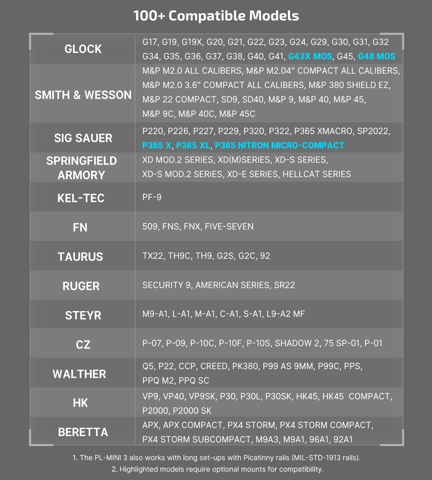 - Špičková všestrannost: Svítilna je vybavena předinstalovanou montáží na lištu Picatinny (včetně adaptérů pro Hellcat, GL a lištu 1913). Díky volitelným montážím pro G43X MOS, P365 a rychloupínací liště dosahuje nové úrovně adaptability.